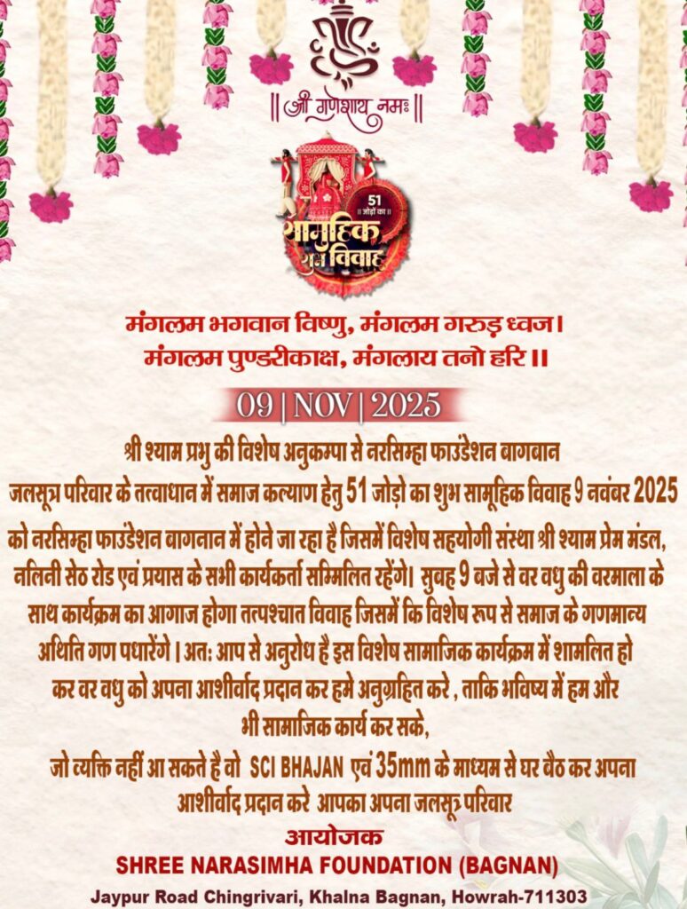 बर्दवान l गत रविवार को नरसिम्हा फाउंडेशन (बगनान) की ओर से कालना में 51 जोड़ियों का सामुहिक विवाह करवाया गया. कार्यक्रम की शुरुआत 9 बजे से हुई और यह पूरा दिन चला. वहां मौजूद सभी ने इस नेक काम में बढ़चढ़कर हिस्सा लिया. आयोजकों में से सुजीत अग्रवाल और विजय चौधरी उल्लेखनीय रहें.